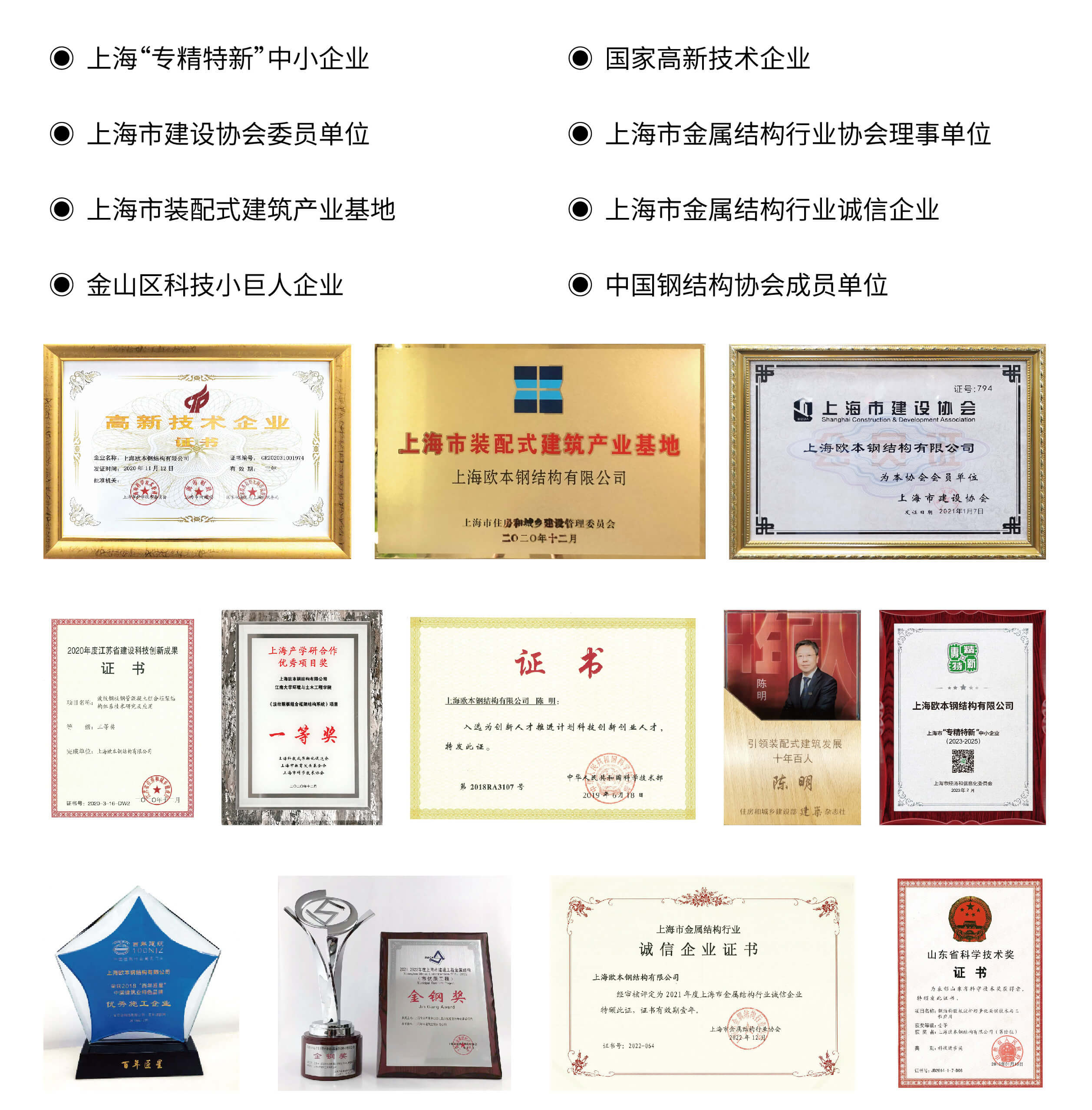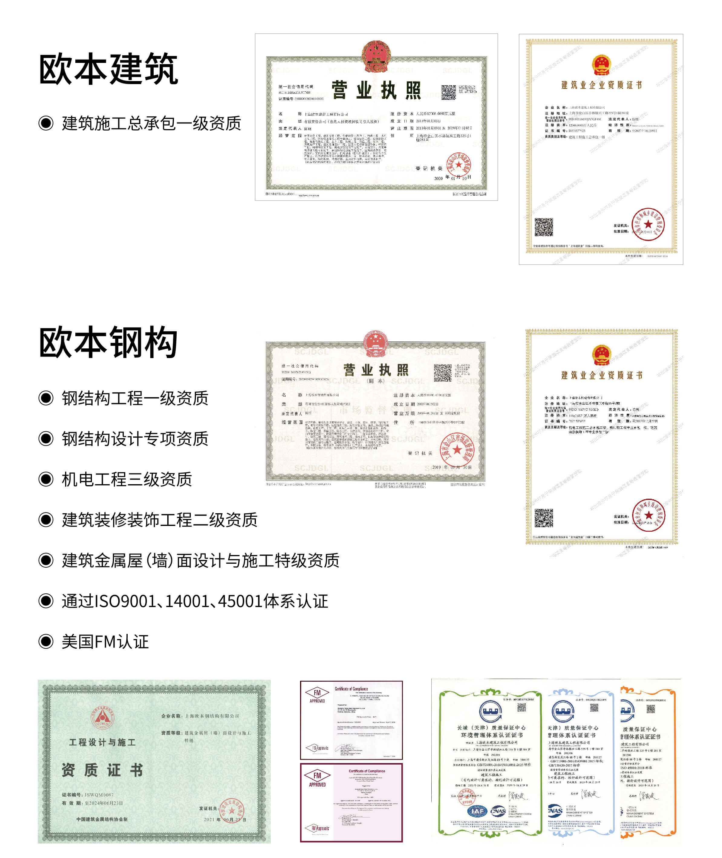 上海歐本擁有鋼結構施工一級、總承包一級資質,有自己完善的質量管理體系,通過ISO9001認證,還擁有FM認證的六個屋面系統(tǒng)。同時歐本也是上海市名牌、高新技術企業(yè)、科技小巨人。